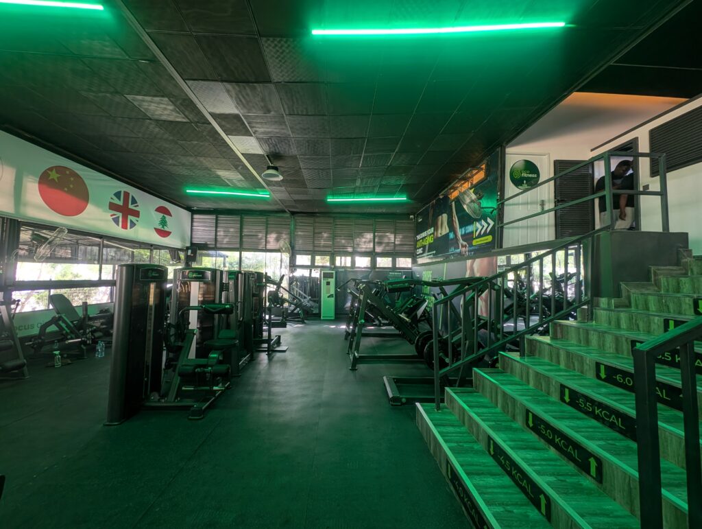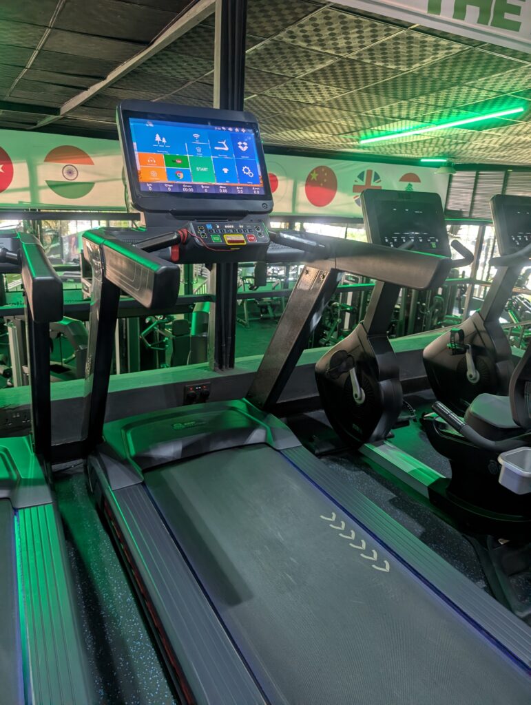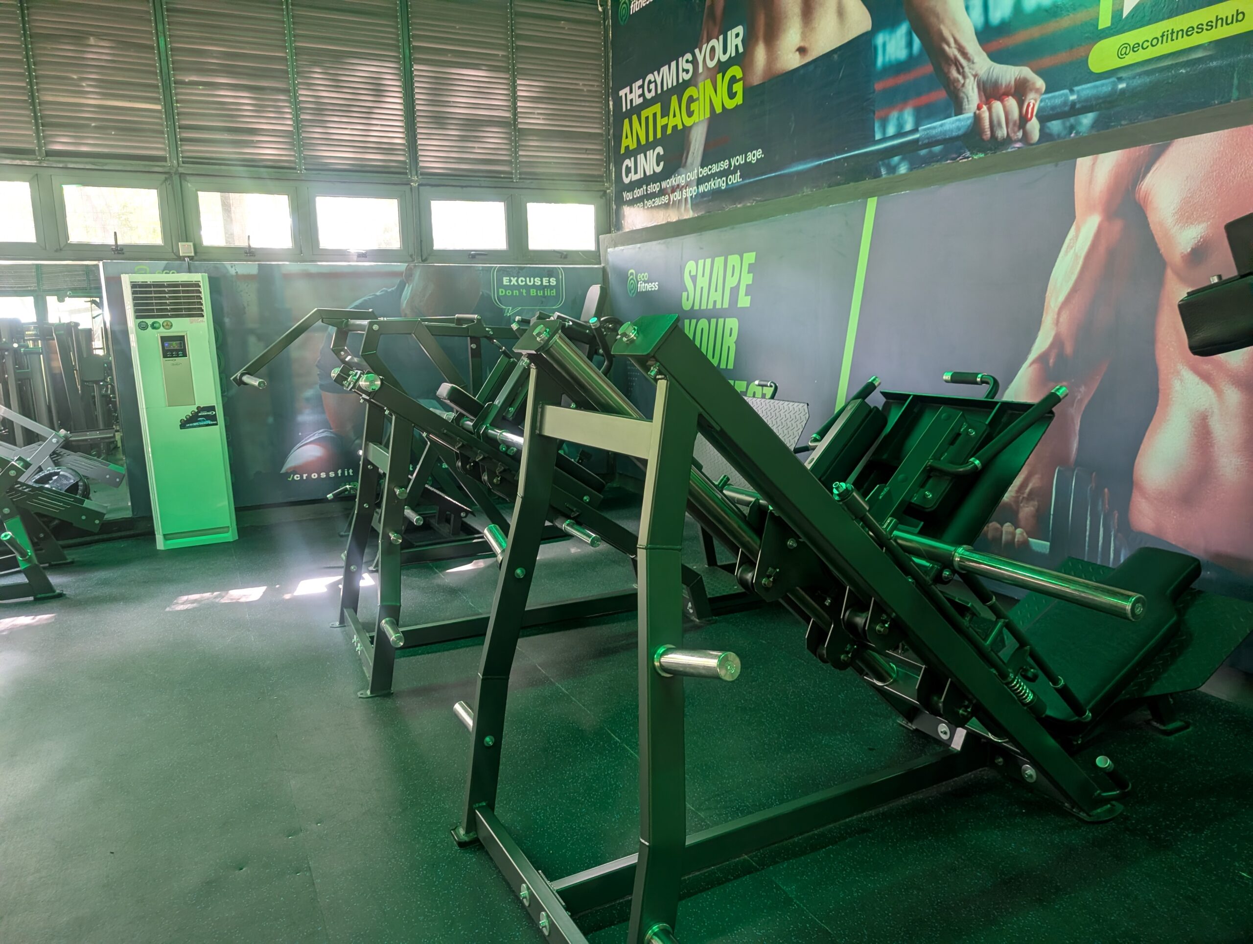 A fully equipped gym with modern, energy-efficient equipment suitable for cardio, strength training, and functional workouts.